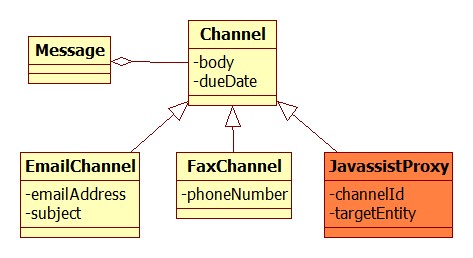 La raison est simple. Lorsque Hibernate charge l'entité Message de la base de données, il connaît la valeur de clé étrangère pointant sur le Channel. Mais c'est tout ce qu'il sait. Impossible de savoir si le Channel référencé est un EmailChannel ou un FaxChannel. Alors que va faire Hibernate ? Créer une instance d'un proxy Javassist ou CGLIB: